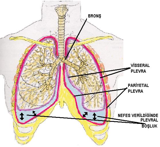 Plevra,Plevra, göğüs boşluğunu çevreleyen ve akciğerleri örten iki yapraklı, tabakalı, ince, seröz bir zardır. Bu zarın iç ve dış yaprakları arasında bir miktar hava ve sıvı ile dolu küçük bir boşluk bulunur. Bu boşluğa Plevra boşluğu denir. Plevranın iç yaprağı, buna Viseral plevra denir, akciğer dokusuna ondan ayrılmayacak biçimde sıkıca tutunmuştur. Visaral plevra aynı zamanda akciğer dokusunun derinliklerine lopçuklar arasına uzantılar gönderir. Plevranın dış yaprağına Parietal plevra denilir.